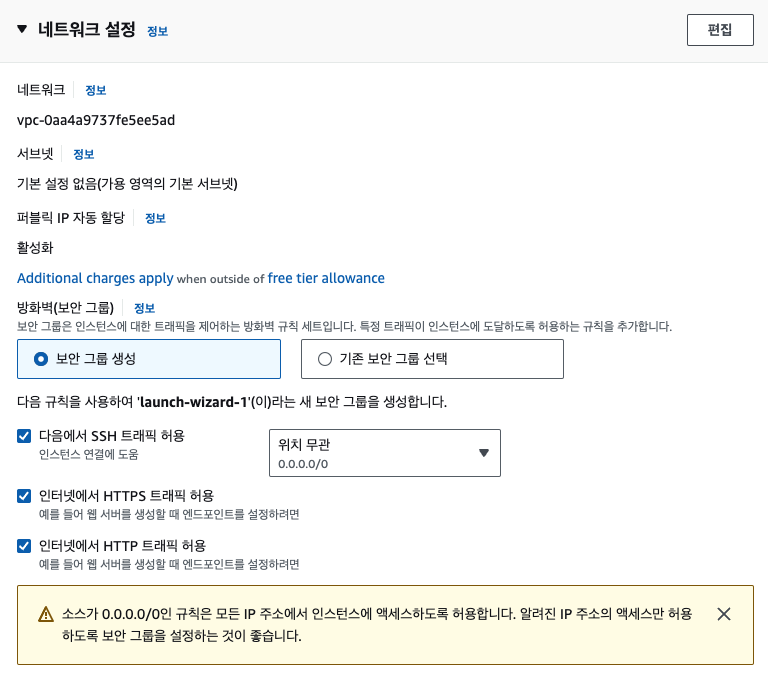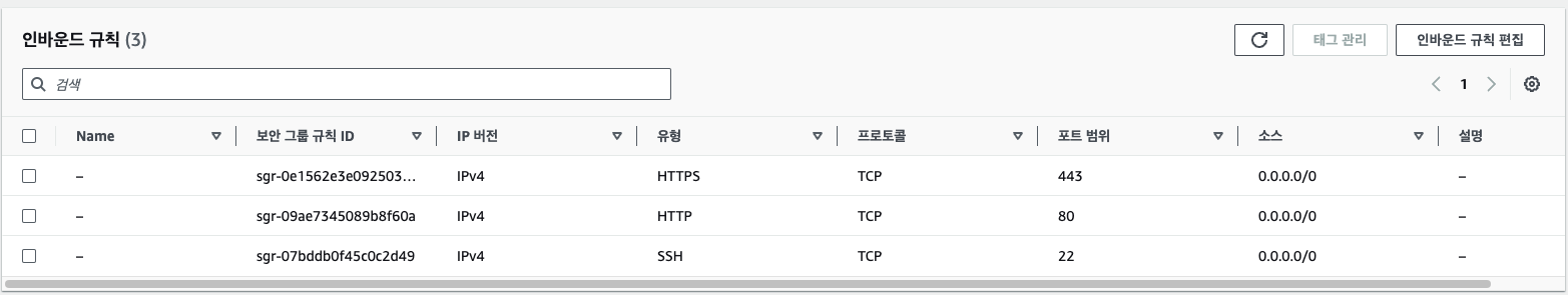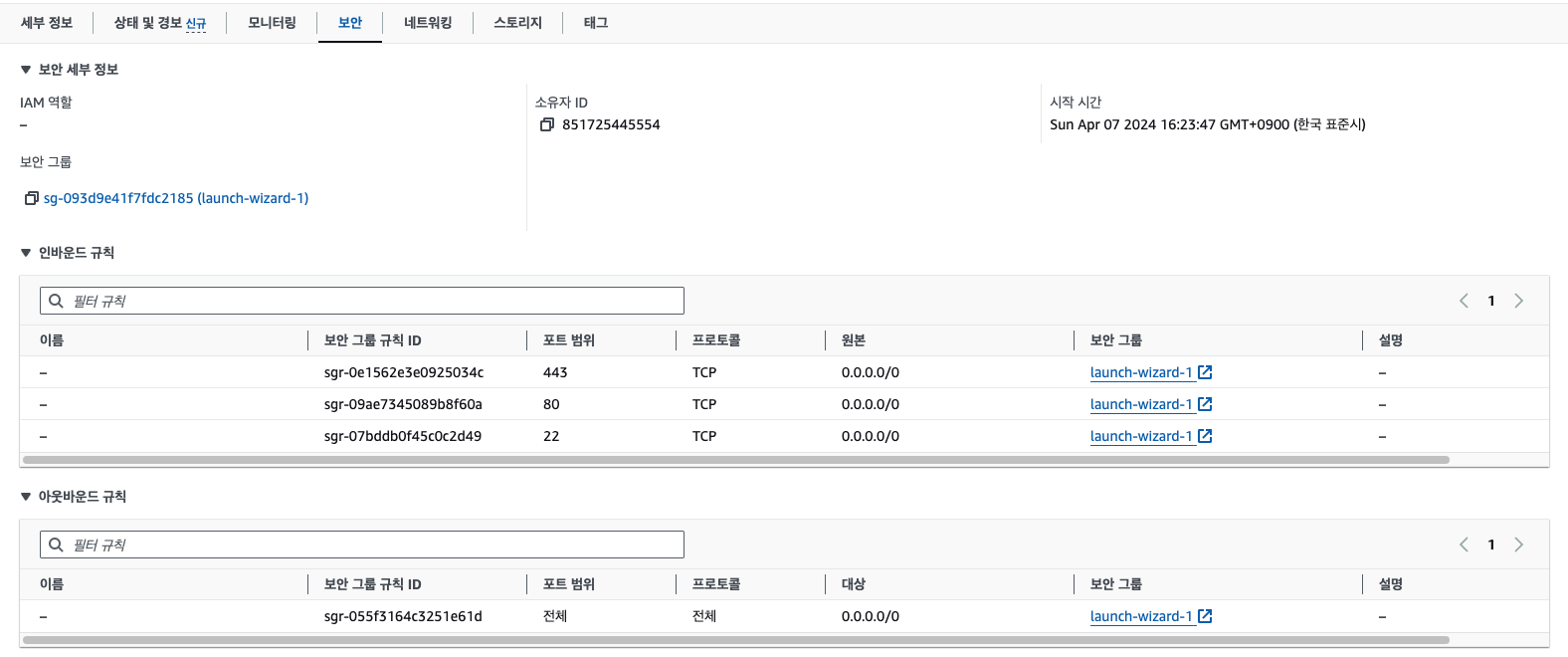 생성된 인스턴스를 클릭 후 보안 탭으로 들어가면 이렇게 보안 그룹이 뜬다.