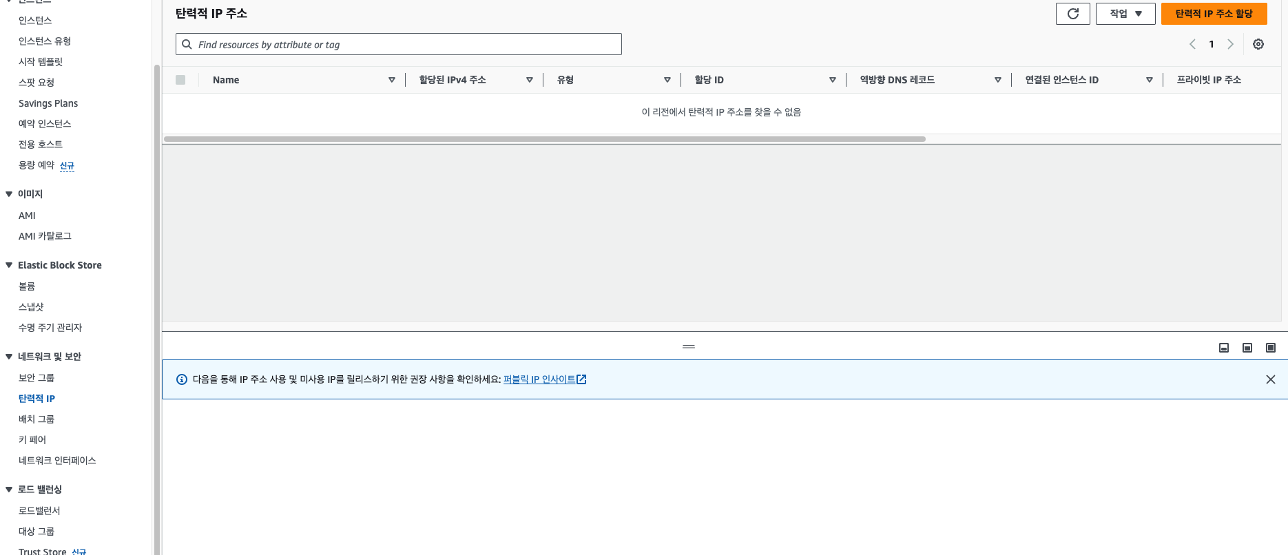 처음 EC2 인스턴스를 만들게 되면, 탄력적 IP가 할당되어 있지 않은 상태이다.