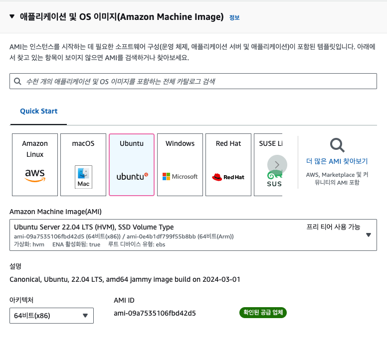 여기서 주의할 점은 프리 티어 사용 가능이라는 저 문구가 뜨는지를 확인해야 한다. 그렇지 않으면 요금이 발생될수도 있으니 주의해서 선택하고, 원하는 OS를 골라 선택하면 된다.