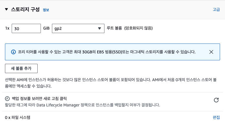 프리티어 요금제는 최대 30GB까지 스토리지 용량을 설정할 수 있다. 기본 설정은 8GB인데, 가능한 많은 스토리지 용량을 확보하기 위해 30GB로 설정해주자.