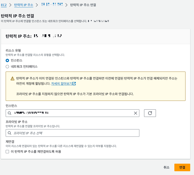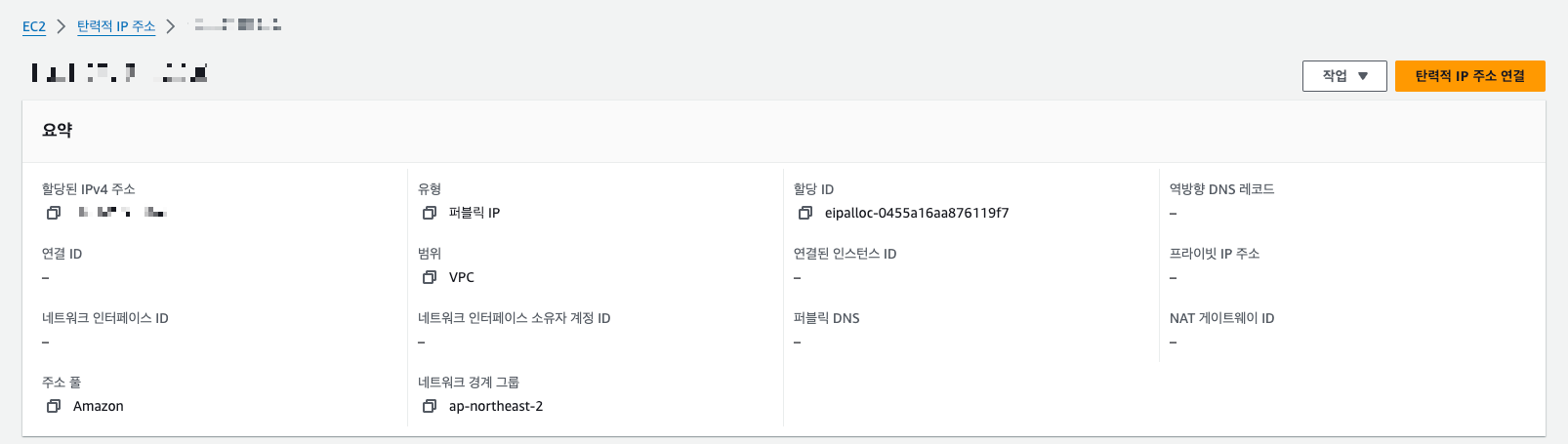 인스턴스를 연결시켜주고, 연결 버튼을 누르면 탄력적 IP 주소가 할당된다!!
