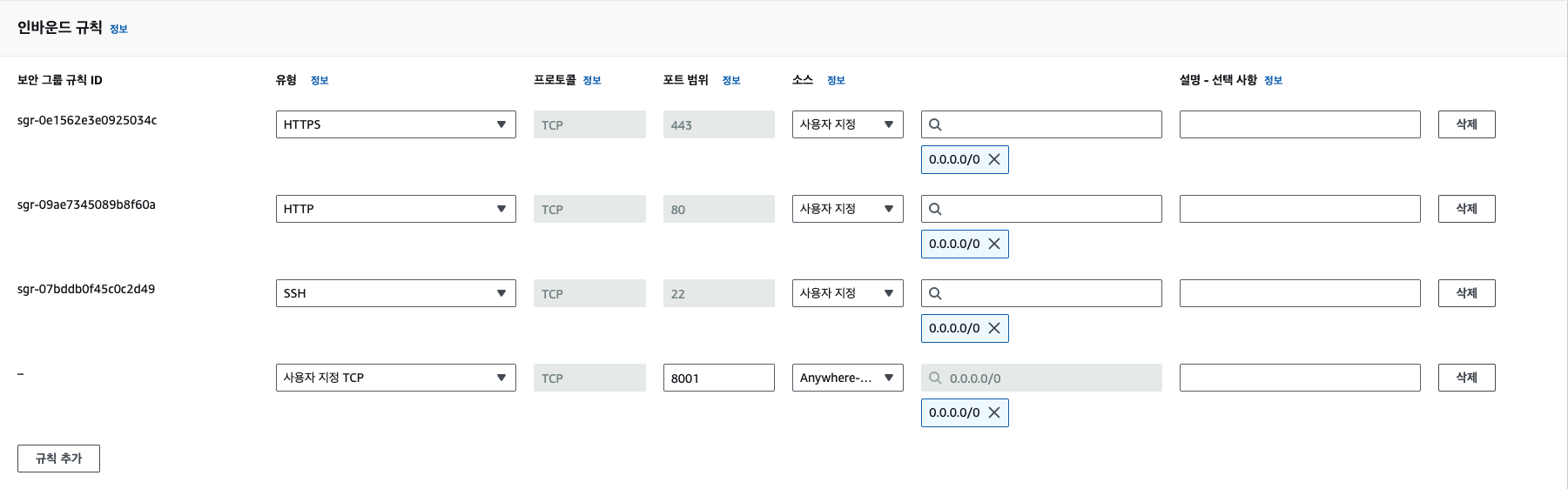 새로운 규칙을 추가해준다. 나같은 경우는 백엔드 서버 포트가 8001번이기 때문에 8001번으로 설정해두고, 0.0.0.0/0으로 모든 IP에서 액세스할 수 있도록 설정해주었다.