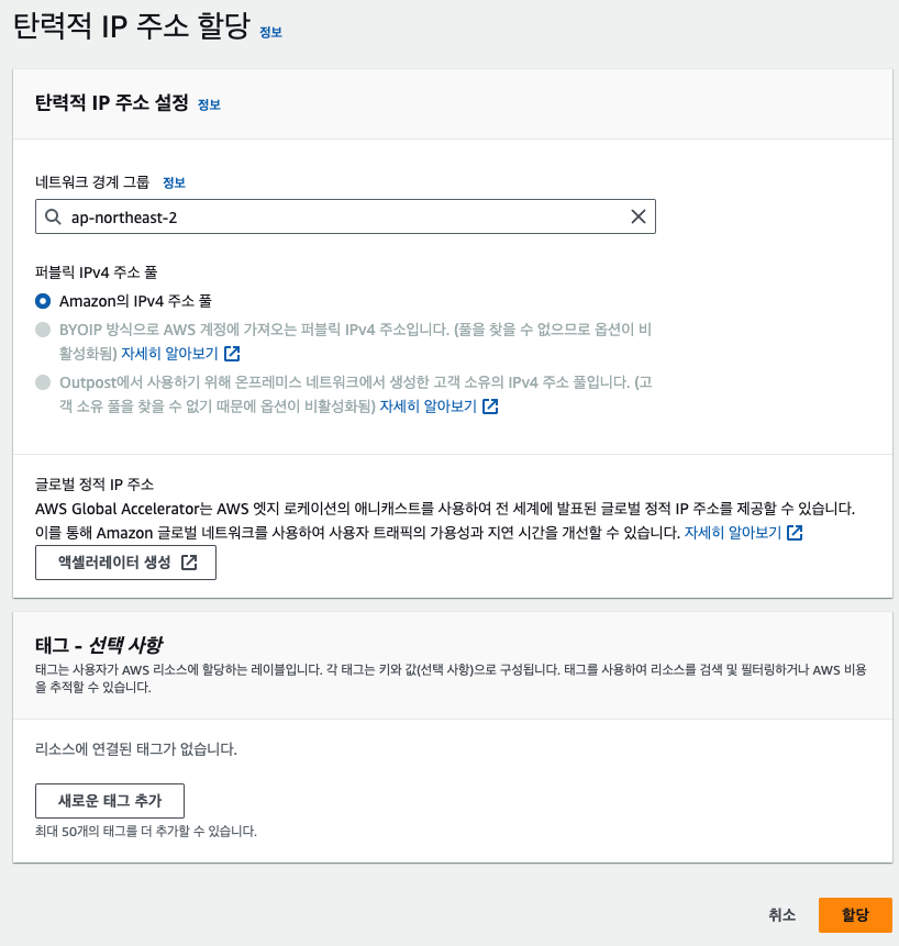 왼쪽 탄력적 IP 클릭 > 탄력적 IP 주소 할당 버튼을 클릭한다.
